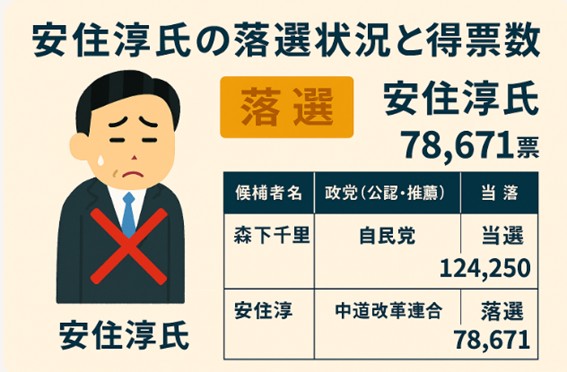 得票数は78,671票で、対立候補の森下千里氏(124,250票)に45,579票の差をつけられての2位落選という結果でした。